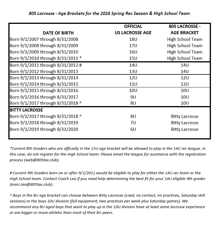 For information on what age bracket your son falls into, please review the USA Lacrosse approved age bracket table that we will be using for the 2026 season (see below). All age groups for each geographical area typically practice on the same field and at the same time, but game times for the different age groups may vary. In other words, the U10 and U12 and U14 players for a given practice location usually practice at the same field and at the same time, but game times on Saturdays will vary based on age.